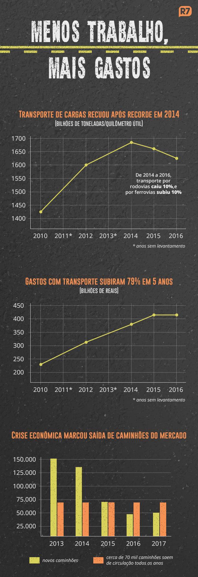 Considerando os anos fechados de 2014 a 2016, o volume de carga transportada por todos os modais caiu de 1,68 trilhão de toneladas por quilômetro útil para 1,62 trilhão, de acordo com levantamento da consultoria logística Ilos.O recuo total foi de 3,4%, mas as consequências foram mais graves para as rodovias, que perderam 10% do volume transportado em dois anos, enquanto as ferrovias aumentaram em 10% sua participação.